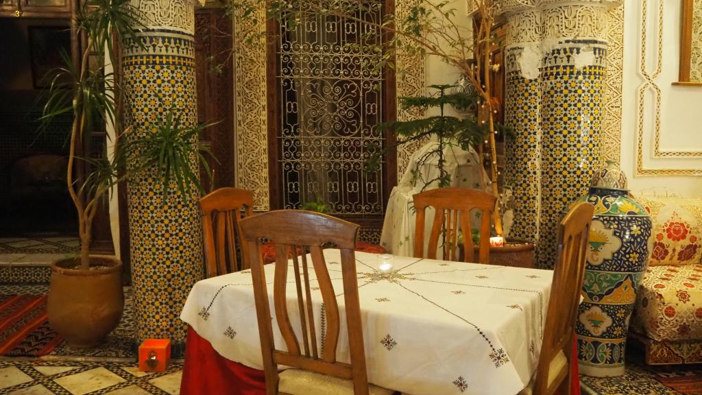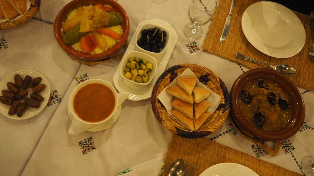 還沉浸在這猶如夢境般的欣喜中,管家已把晚餐準備好,邀請我們入座,Riad Sara的晚餐採預訂制,要提前點餐,由於都是女生吃得並不多,我們只點了幾樣想嘗試的菜色,不知道是舒適的氛圍使然,還是管家的手藝超群,原本以為摩洛哥式的料理都大同小異,但沒想到同樣的菜色卻仍能做出口味上的差異,讓我們每個人都吃得津津有味。