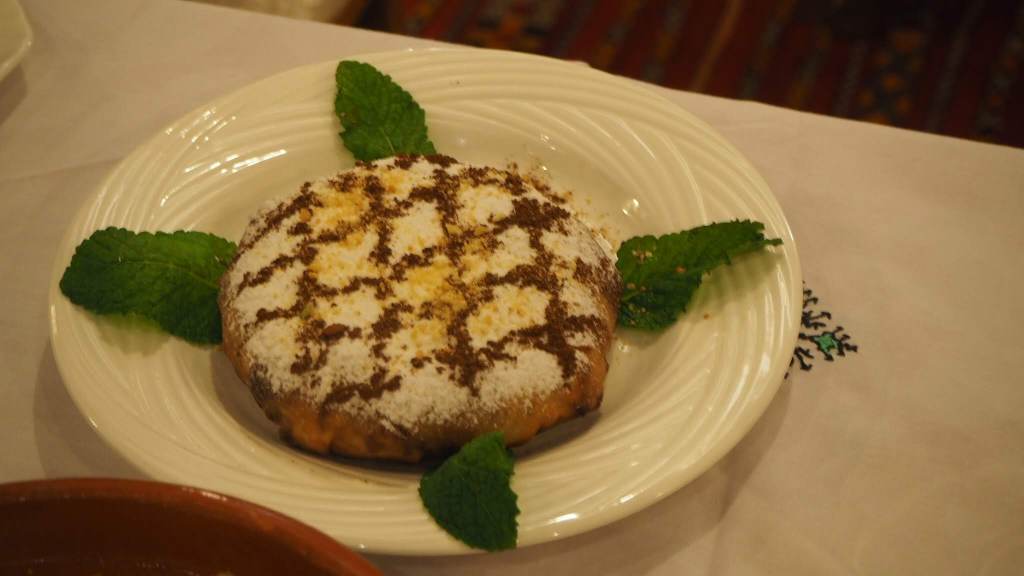 其中最讓人驚豔的就屬Bastila了,薄而脆的餅皮包裹雞肉餡,疊上一層烤杏仁,最後撒上肉桂和糖;原是一道需耗時兩天製作的宮廷菜餚,後來經過不斷的改良,成了來摩洛哥必吃的美食。