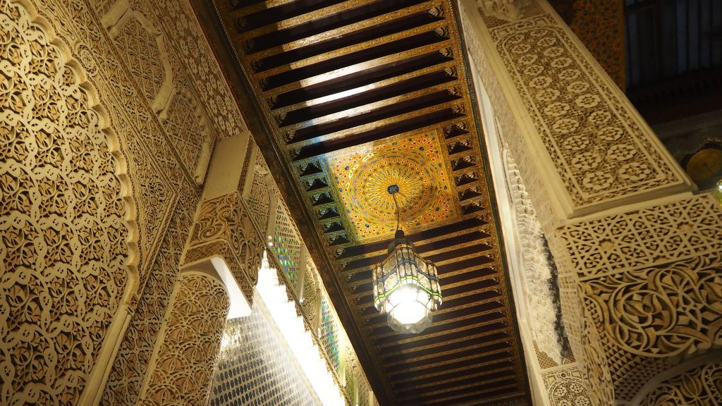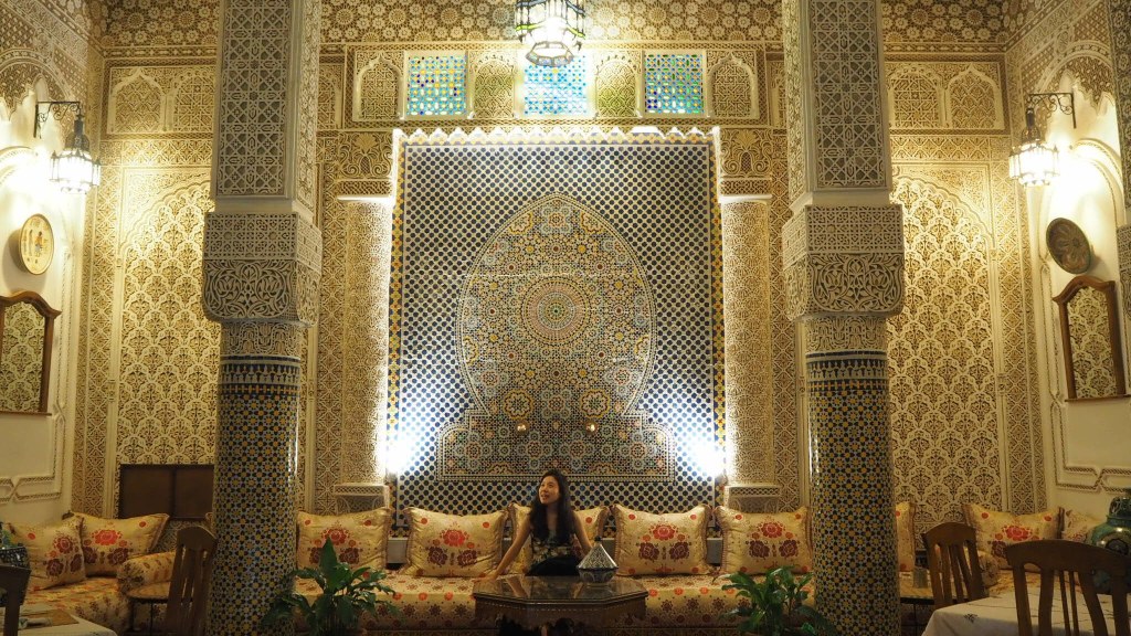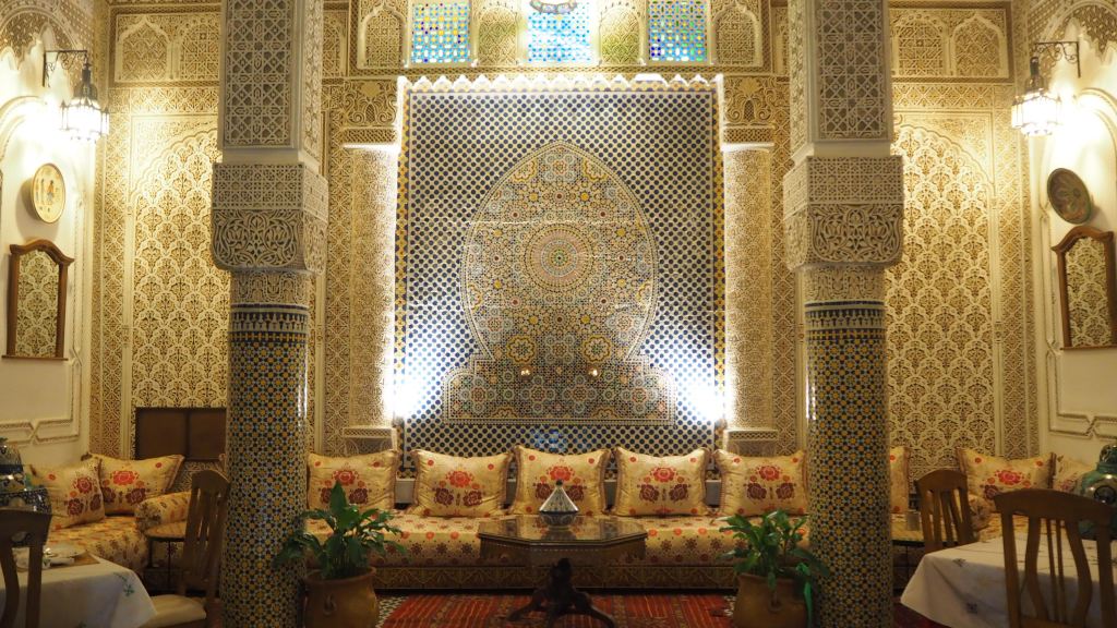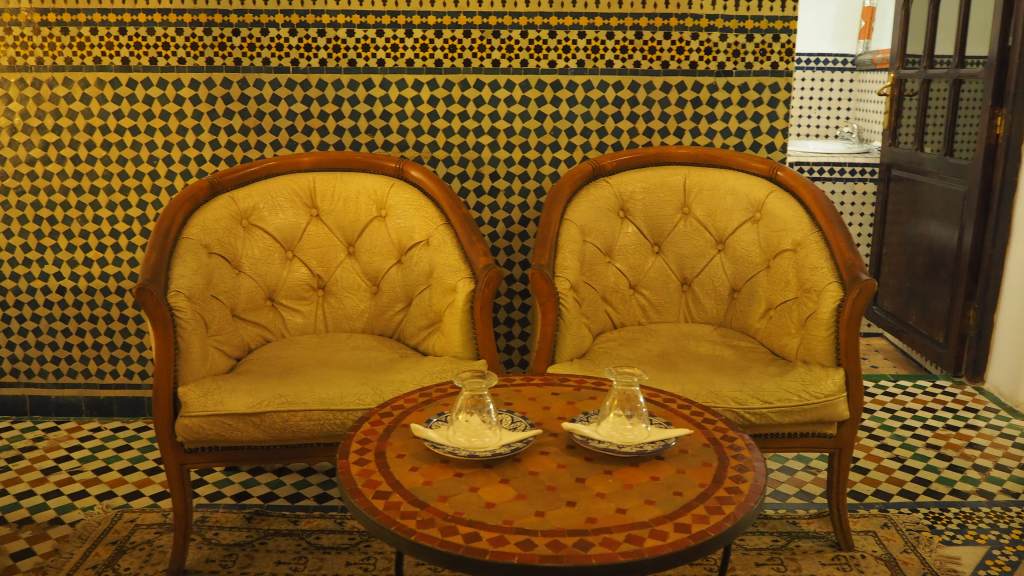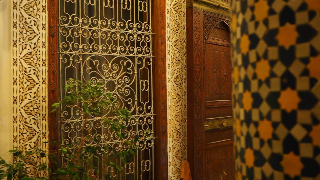 管家端上一盤熱呼呼的薄荷茶,請我們在大廳先稍作歇息,我毫不猶豫的窩入柔軟的沙發裡,後方挑高的巨牆上拼貼著數不清的小磚,一塊連著一塊堆疊成細緻而繁複的花紋圖騰,彷彿小時候那支愛不釋手的萬花筒裡頭變化萬千的花花世界。
