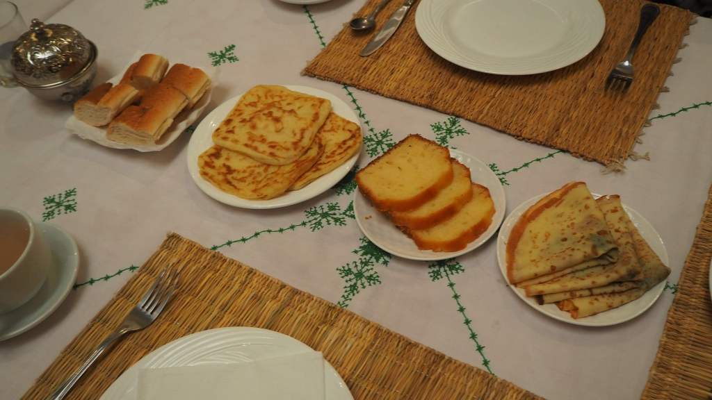 才剛在桌前坐定,管家便急匆匆的端出了早餐,有麵包、厚餅、糕點、薄餅(因為不知道它真實的名字,我只能用薄厚區分它),雖不及台灣早餐美味多層次,但以摩洛哥的早餐來說,這樣算是非常豐盛了,偏乾的麵包與餅類,搭配現榨的新鮮柳橙汁,也足以圓滿一整個早晨。