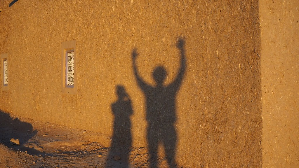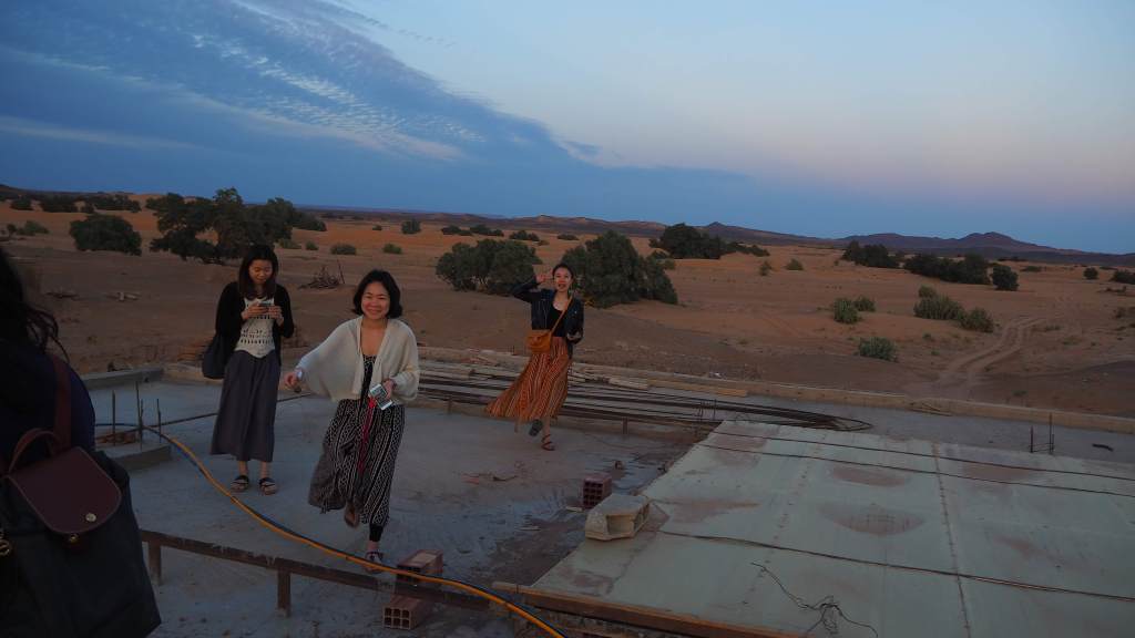 泥土階梯往向上,是Kasbah Casa Khamlia的樓頂,沒有豪華民宿的陽台雅座,只是一個簡單的平台,以泥土和稻草攪和、曝曬壓製而成的土塊,一點一點加蓋堆疊造起的土房,其實並不堅固,有時只要一場大雨就能使其一夕坍塌,踩踏在平台上的雙腳,都可以很明顯地感覺到有幾處已經有些鬆軟,我們避開平地,謹慎地踩在較厚實的突起處,生怕一不留神屋頂就會整個塌陷。