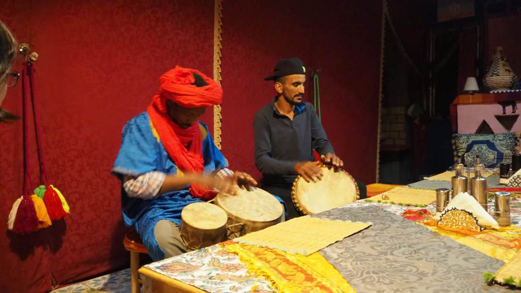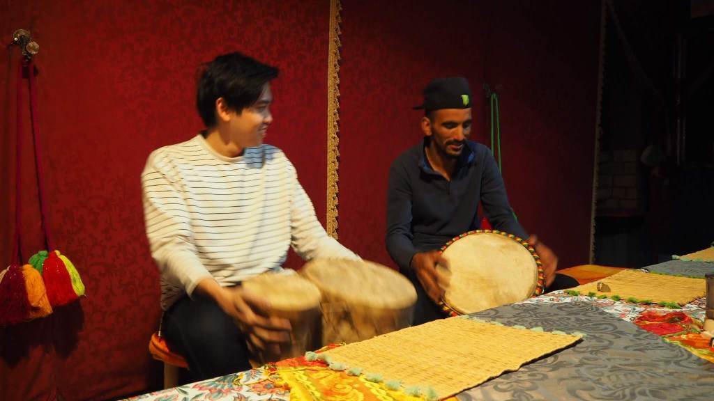 夜幕低垂,我們在客廳開了一個小小的非洲鼓派對,Abdellah拉著大家打起非洲鼓來,不需要語言,只用音樂溝通;單調的鼓聲在不同力道、不同手勢、不同位置的拍打出不同層次與節奏,在這寂靜的暗夜裡敲打出一齣屬於我們的摩洛哥之曲。