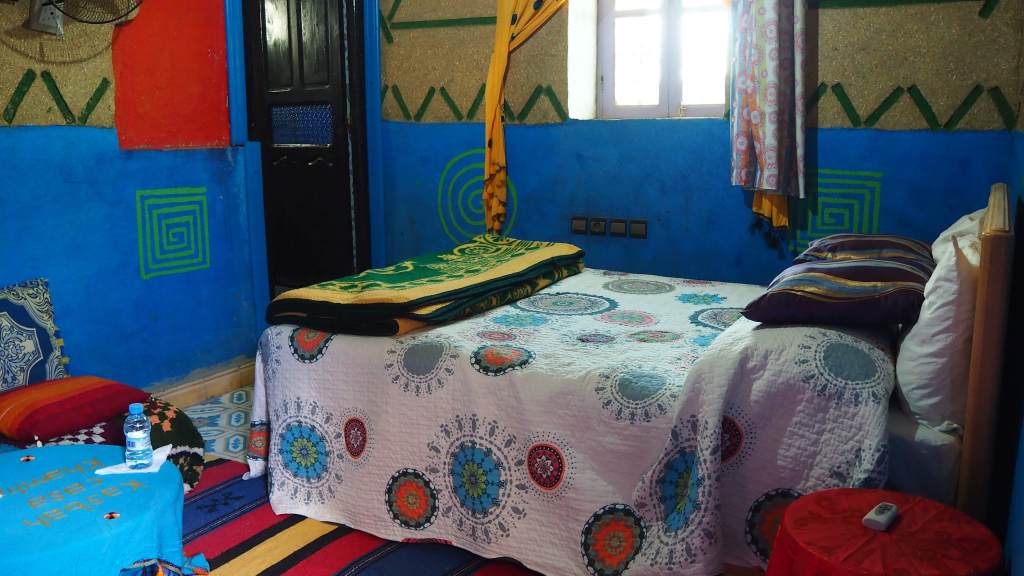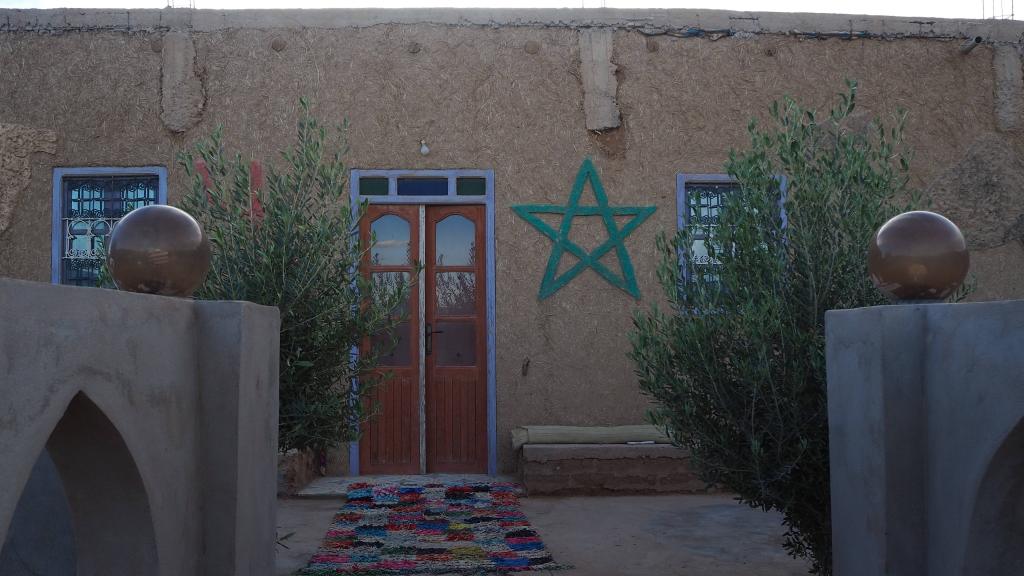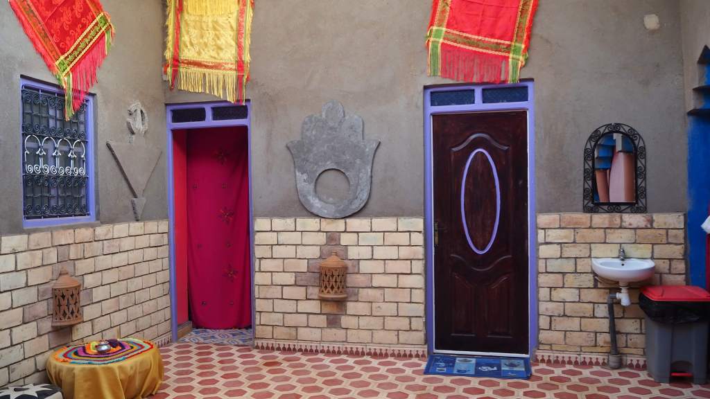 在這些相似的土房中,有一棟特別顯眼,大門漆上了橘紅色,豪氣地寫上大大的「Kasbah Casa Khamlia」,門上頭插著一列像是蠟筆的彩色圓柱裝飾,使我誤以為這裡是一間小朋友學畫畫的才藝班,有夠天才!但說不定這裡真的有畫畫才藝班?