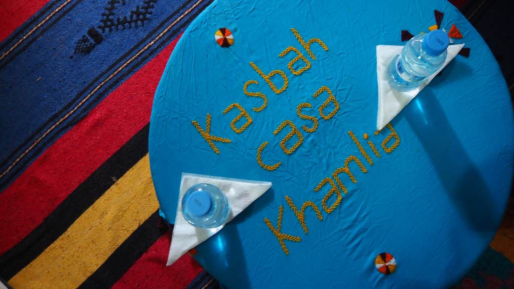 簡單的房間鋪上可愛的床套被單,一旁的小桌桌巾,Abdellah一針一線地繡上「Kasbah Casa Khamlia」的字樣,童趣又可愛,沙漠寒涼的夜裡什麼都沒有,也無須找些什麼是做,只是慵懶地倒在沙發和地毯上就很滿足。