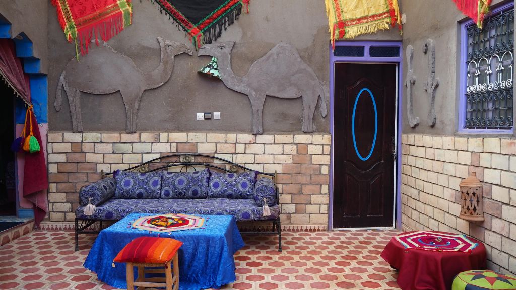 繞過簾布,後方還有一個小小的休息區與天空相望,兩隻正在談天的大駱駝、伊斯蘭教的法蒂瑪之手(Hamsa)懸於牆上,這全都是主人用泥土砌成的。