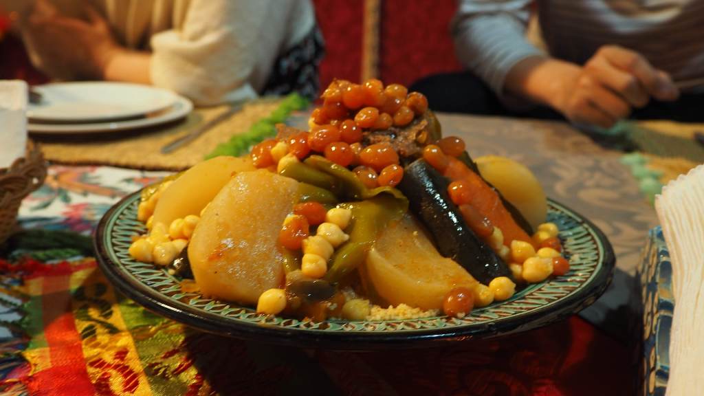 濃郁的鷹嘴豆濃湯,滑過時的沙沙口感還停留在舌尖;塔吉鍋內燉煮好幾個小時的牛肉,在口中慢慢化開,沒有過多的調味,吃得出食物新鮮純粹的原味;兩大盤庫斯庫斯,是Abdellah妹妹的招牌菜,小麥米的濕度恰到好處,時蔬吸收了湯汁的精華,再撒上酸甜的果乾,一起送入口中,簡單樸實的菜色,卻吃得出用心的家常美味。