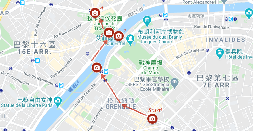 起了個大早,我們從小公寓往鐵塔的方向步行,兼作早晨的運動時間,鐵塔周邊可以拍照的點非常非常多,看了許多分享打卡點的文章後,我們選擇了幾個點,安排了一個比較順路的路線: